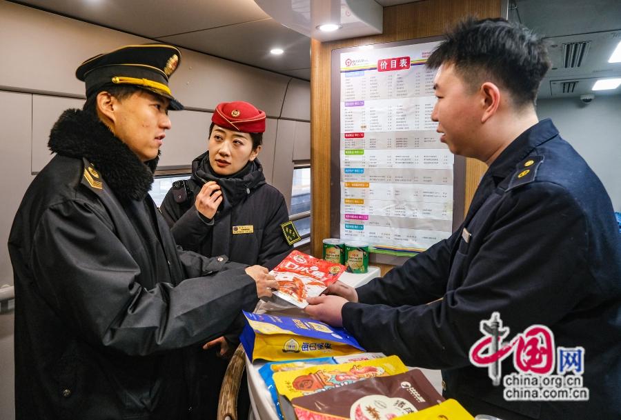 2026年铁春运今日启动,组织监视员对管辖坐区食物运营商户、餐车、快餐配送等单元的原料储存、食物加工、温控设备运转情况、收集订餐及食物从业人员上岗证件等环节环节进行监视查抄,疾控核心工做人员正在天津西坐内超市对售卖食物进行监视查看。中国网发杨宝森 摄